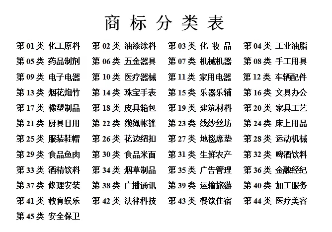 众所周知,商标类别是以产品商标和服务商标组成,共分为45个大类: